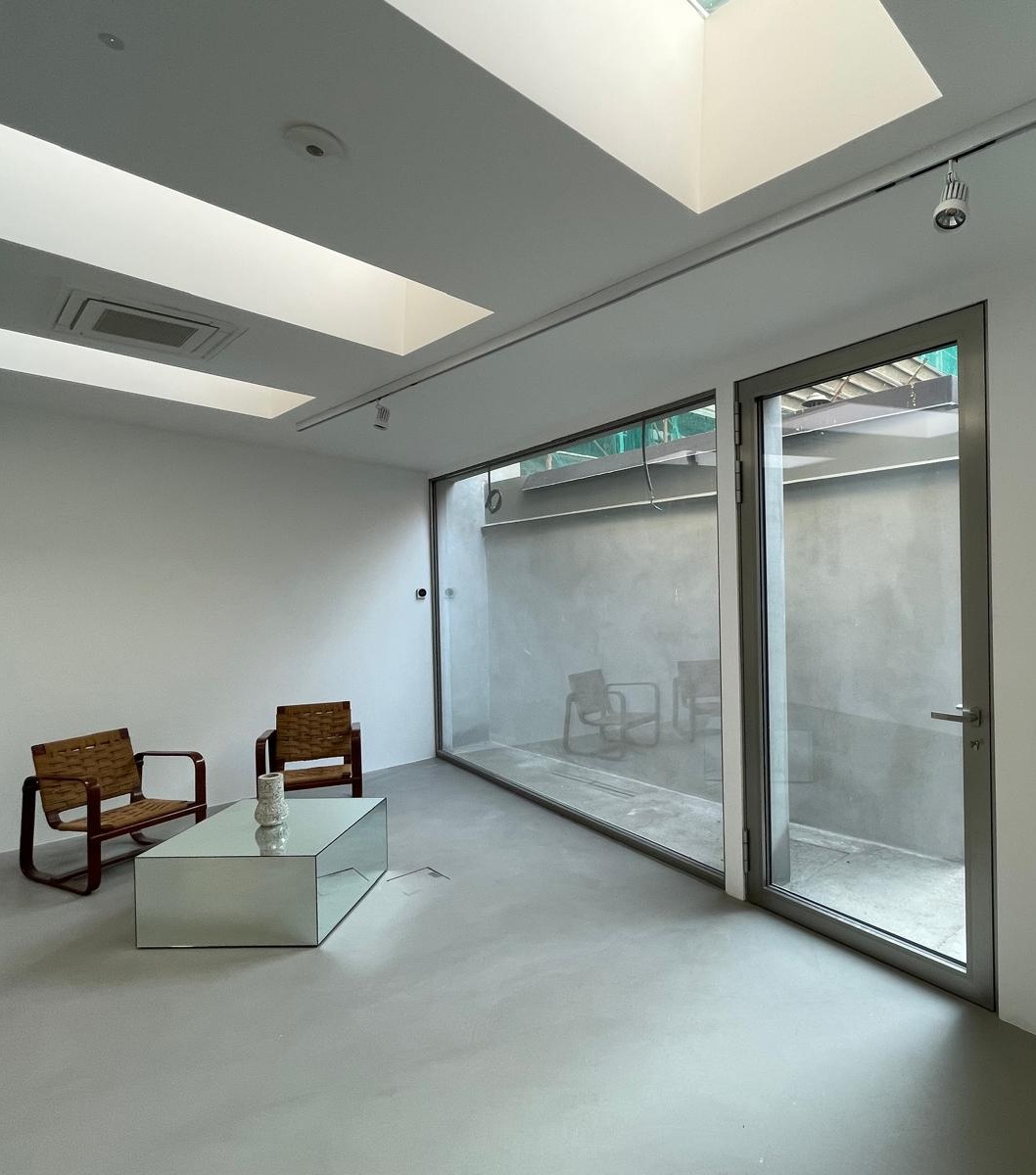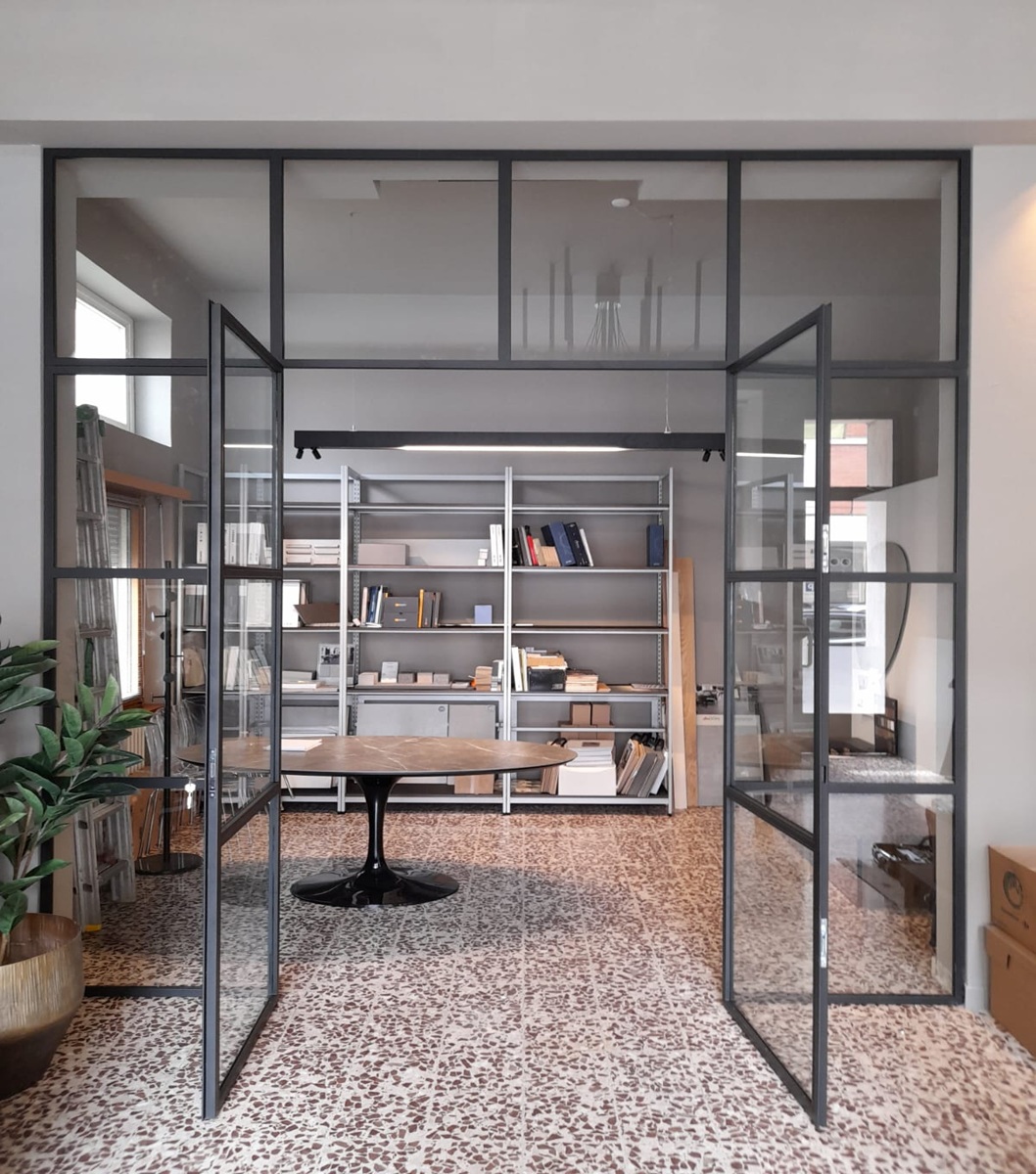 Struttura divisoria in ferro realizzata su misura, progettata per separare gli spazi mantenendo leggerezza visiva e continuità luminosa.